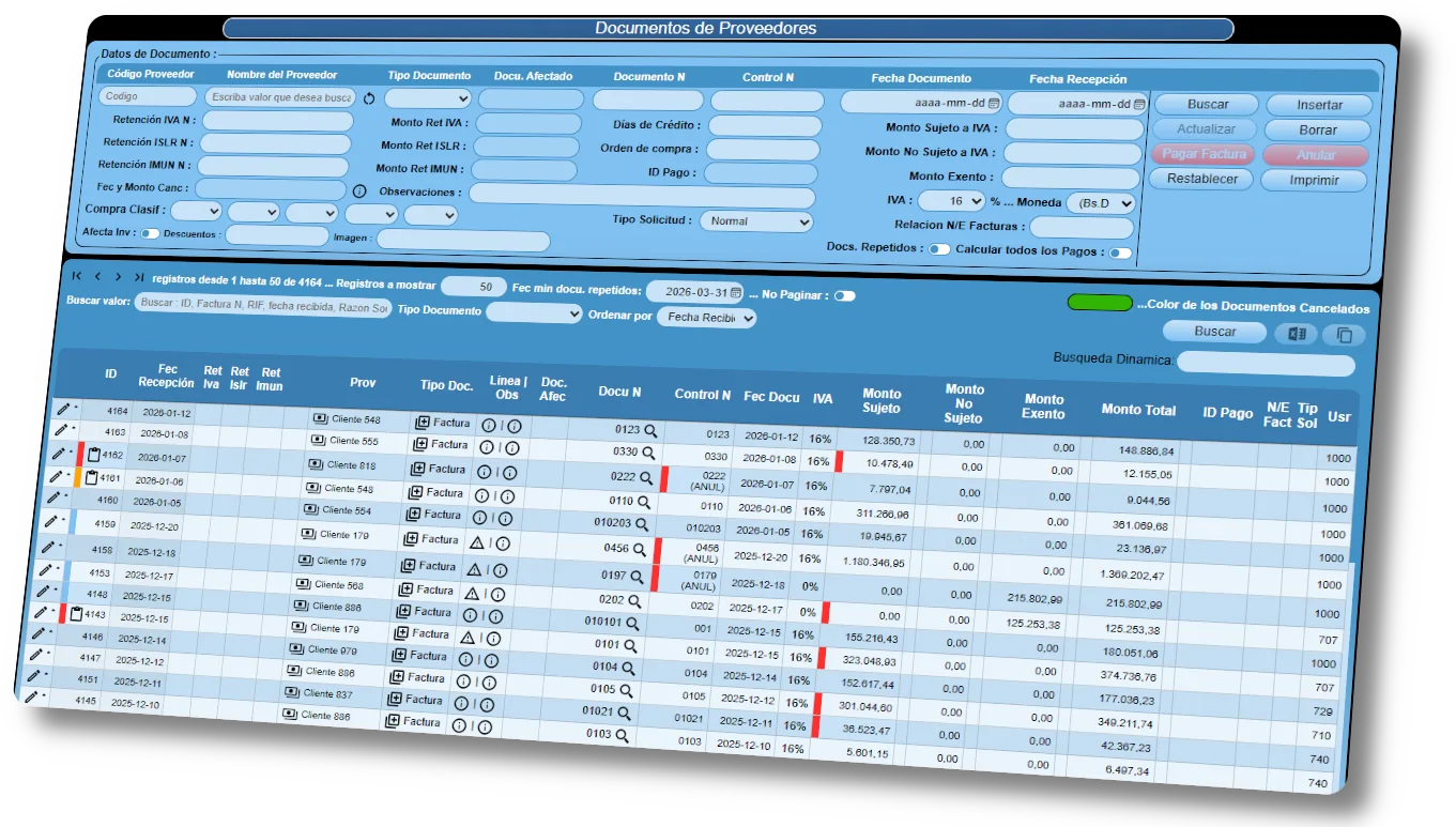 La eficiencia operativa se consolida en el registro centralizado de facturas, notas de débito y crédito. Debido a que el sistema integra validaciones automáticas, se garantiza la integridad de los montos y la coherencia con el libro de compras. Asimismo, la automatización de las retenciones de IVA e ISLR se ejecuta según la normativa del SENIAT, asignando números de retención solo si se cumplen las condiciones configuradas. Por consiguiente, el departamento administrativo elimina el re-trabajo y asegura que cada documento esté vinculado a su soporte digital (PDF/Imagen) para auditorías inmediatas.