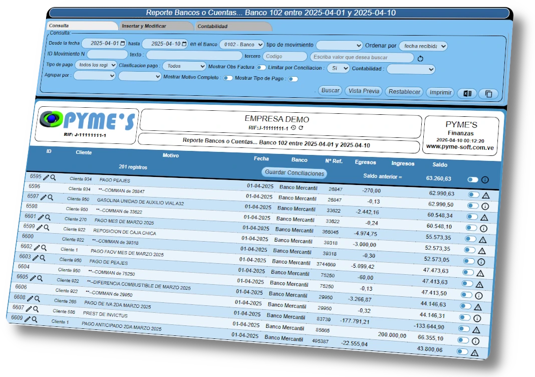 Recuerde que el Módulo de Finanzas de Pyme’S utiliza una arquitectura de base de datos relacional que impide descuadres entre módulos. Efectivamente, cada movimiento bancario está vinculado a su origen operativo. Por lo tanto, usted cuenta con una trazabilidad de 360 grados que facilita cualquier proceso de auditoría externa o revisión fiscal.