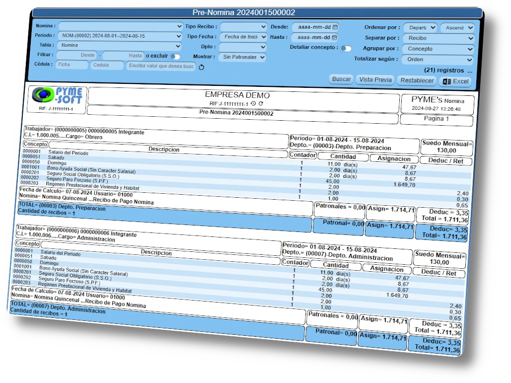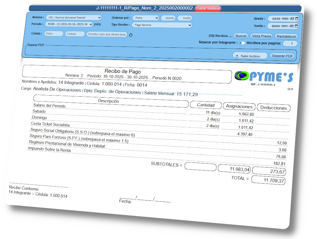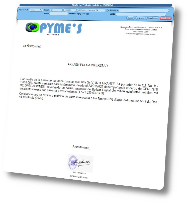¿Sigue calculando su nómina manualmente y teme una inspección del MINTRA? El Módulo de Nómina de Pyme’S automatiza cada aspecto de su gestión de personal. Como resultado, usted elimina errores costosos y garantiza el cumplimiento de la LOTTT y las normativas de los entes legales.