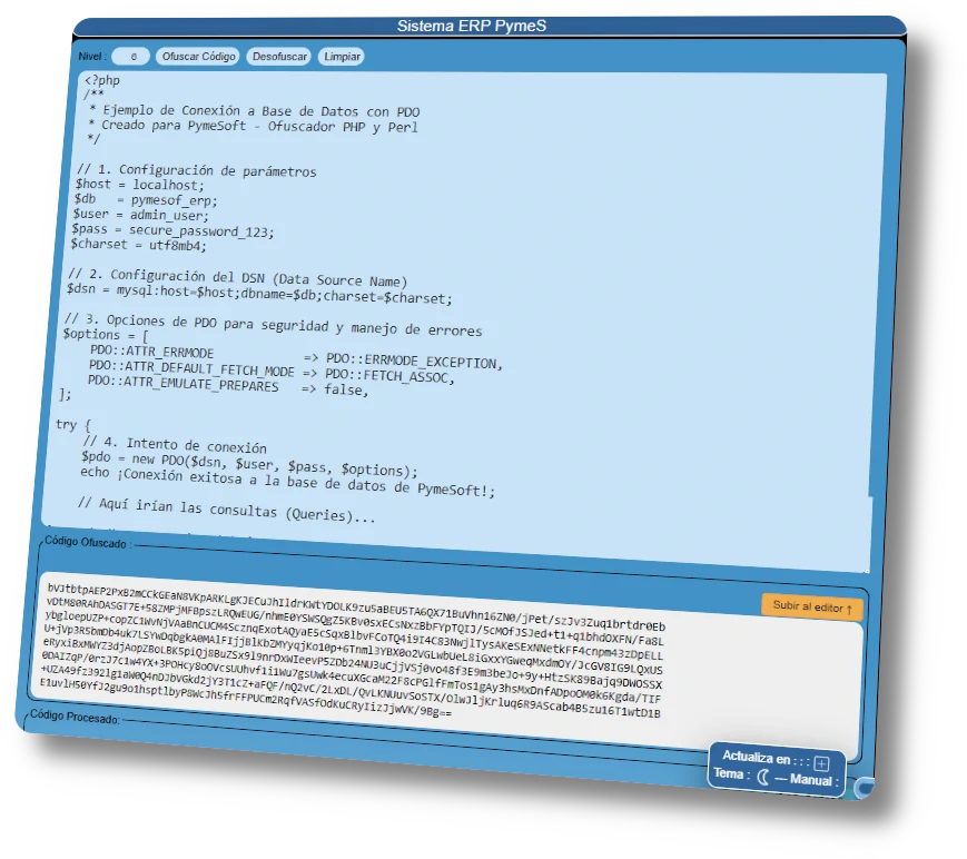 Ofuscador PHP y Perl: Protección de Propiedad Intelectual En el entorno competitivo del desarrollo de software, la protección de la lógica de programación es una prioridad estratégica antes de la implementación en servidores externos. Efectivamente, PymeSoft ofrece este Ofuscador PHP y Perl como una solución robusta para empresas y profesionales que requieren integrar una capa de privacidad avanzada en sus proyectos. Esta herramienta garantiza que el código fuente mantenga su funcionalidad íntegra mientras se mitiga el riesgo de exposición de algoritmos críticos. Por consiguiente, las organizaciones pueden distribuir scripts con la seguridad de que su propiedad intelectual está blindada contra accesos no autorizados.